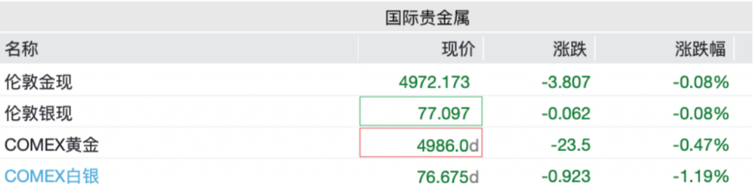 截至发稿,伦敦金报4972.173美元/盎司,下跌0.08%;COMEX黄金报4986美元/盎司,下跌0.47%。伦敦银报77.097美元/盎司,下跌0.08%;COMEX白银报76.675美元/盎司,下跌1.19%。