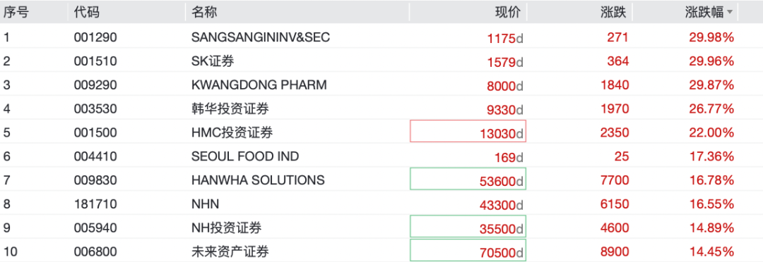 多只券商股大涨,截至发稿,SANGSANGININV&SEC、SK证券等涨幅均超29%。
