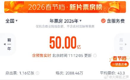 据网络平台数据,截至2月19日11时12分,2026年电影票房(含预售实时)突破50亿元。(大湾区之声)