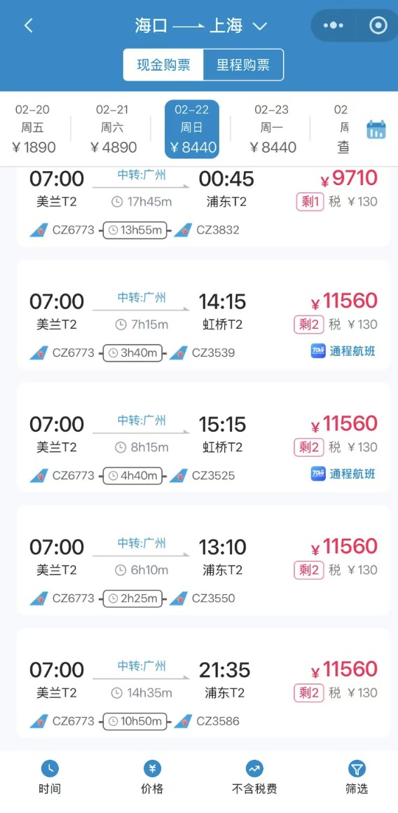 类似的紧张态势也出现在海口至上海航线。记者从南方航空官网了解到,2月22日至23日,海口至上海航线经济舱已全部售罄,仅余少量全价公务舱,最高票价达11560元(不含税费)。