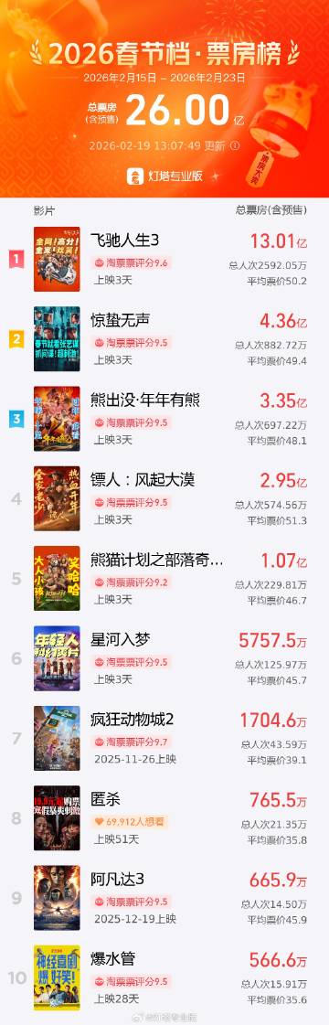 据灯塔专业版,截至2月19日13时07分,2026春节档(2月15日-2月23日)档期总票房(含预售)突破25亿。