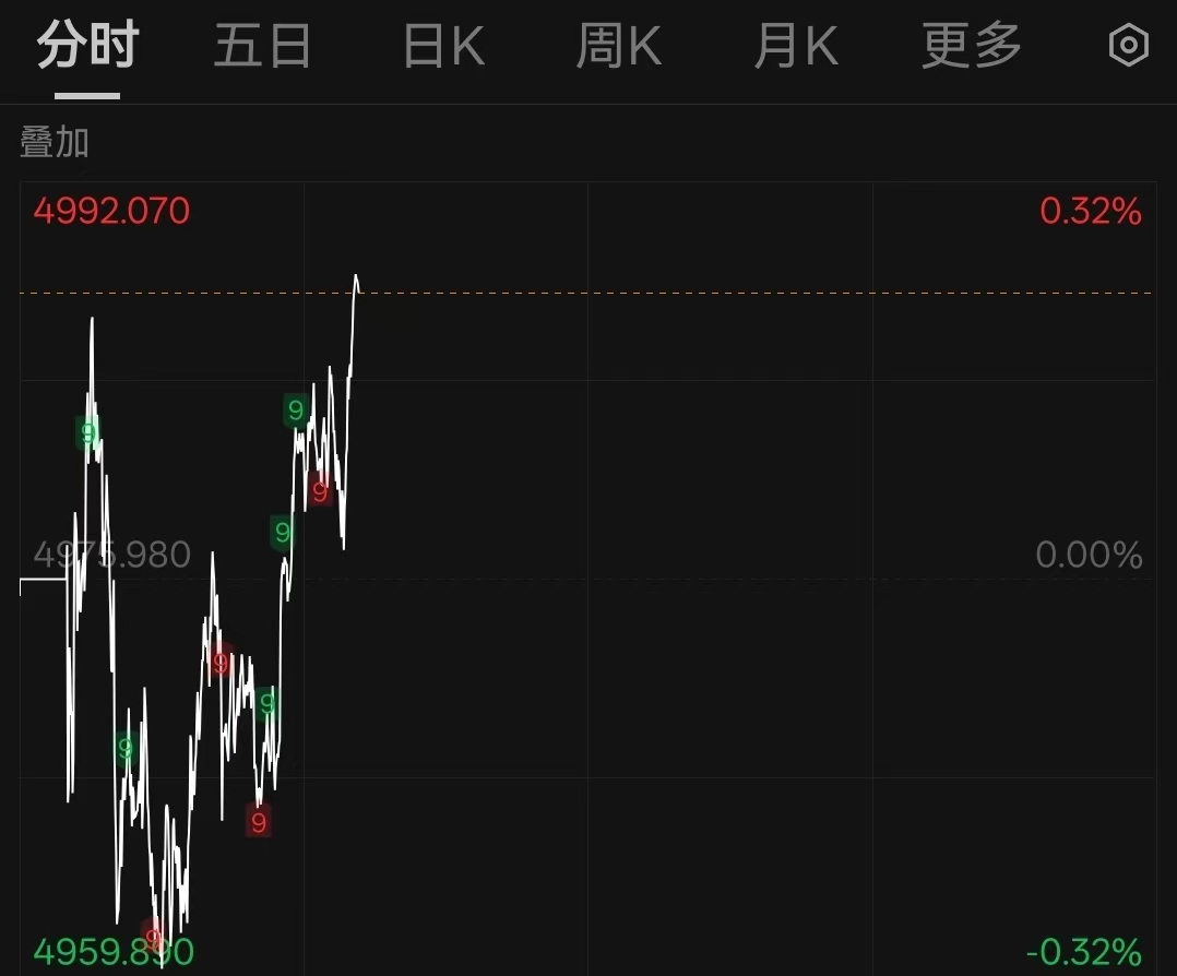 现货黄金一度站上4990美元/盎司,日内涨0.26%。