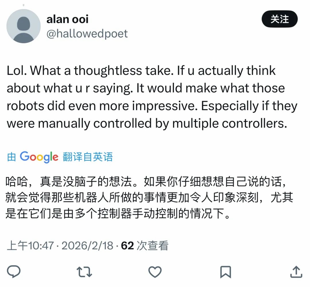 外国网友为中国硬核科技实力点赞的同时,也有人难以置信——“不是真的,是像皮影戏那样,每个机器人都是由一个人类在幕后远程操控的!”