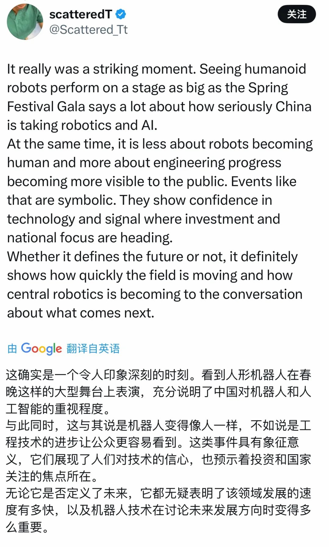 “这确实是一个令人印象深刻的时刻。看到人形机器人在春晚这样的大型舞台上表演,充分说明了中国对机器人和人工智能的重视程度。”