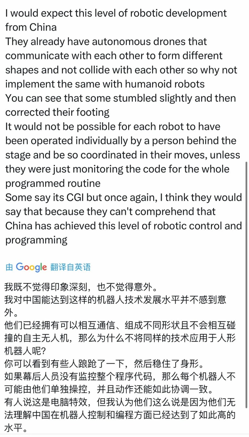 有人坦言:“我既不觉得印象深刻,也不觉得意外。我对中国能达到这样的机器人技术发展水平并不感到意外。他们已经拥有可以相互通信、组成不同形状且不会相互碰撞的自主无人机,那么为什么不将同样的技术应用于人形机器人呢?”