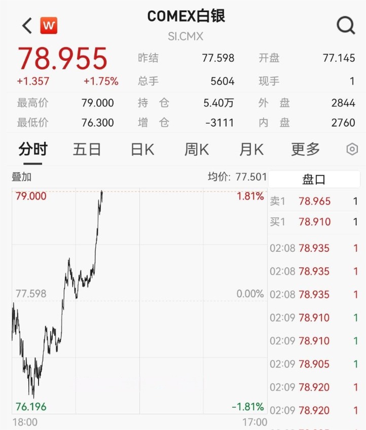 现货白银价格同步走高,盘中突破79美元/盎司,涨幅超2.5%。