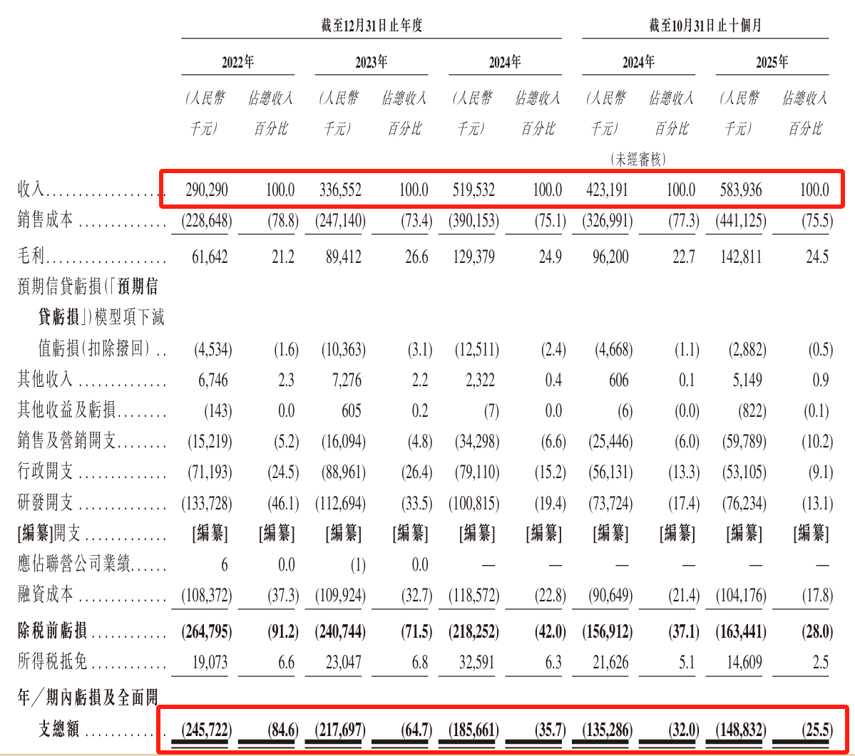 不过,海马云的盈利困局愈发显著。2022年、2023年、2024年及2025年前十个月(下称“报告期”),公司分别产生净亏损2.45亿元、2.17亿元、1.85亿元、1.48亿元。在不足四年的时间里,海马云已累计亏损约7.95亿元。尽管亏损幅度收窄,但沉重的财务成本和巨额研发投入仍是主要负担。