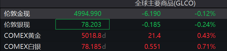 北京时间2月20日早间,国际金银价格下跌。截至发稿,伦敦金现报4994.99美元/盎司,跌0.12%;伦敦银现报78.2美元/盎司,跌0.24%。COMEX黄金涨0.43%,报5018.8美元/盎司;COMEX白银涨0.71%,报78.19美元/盎司。