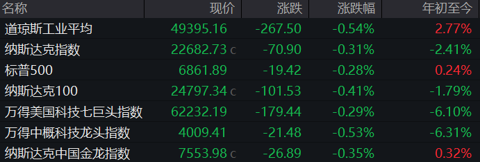 截至当天收盘,道琼斯工业平均指数比前一交易日下跌267.50点,收于49395.16点,跌幅为0.54%;标准普尔500种股票指数下跌19.42点,收于6861.89点,跌幅为0.28%;纳斯达克综合指数下跌70.91点,收于22682.73点,跌幅为0.31%。