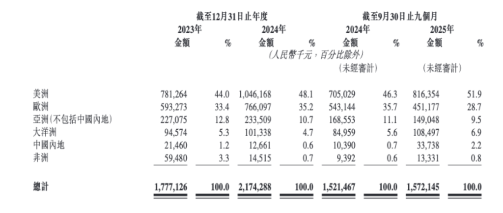 自成立以来,美洲和欧洲是德兰明海业务发展的重点,来自美洲和欧洲的收入占总收入八成。具体看,得益于美国和加拿大市场的持续扩张,2024年,该公司收入的48.1%来自美洲,35.2%来自欧洲,亚洲(主要销往日本,不包括中国内地)收入占总收入的10.7%,大洋洲占比4.7%,非洲占比0.7%,中国内地占比10.6%;截至2025年前9个月,来自美洲的收入占比为51.9%,来自欧洲的收入为28.7%,来自中国内地的收入占比上升至2.2%。