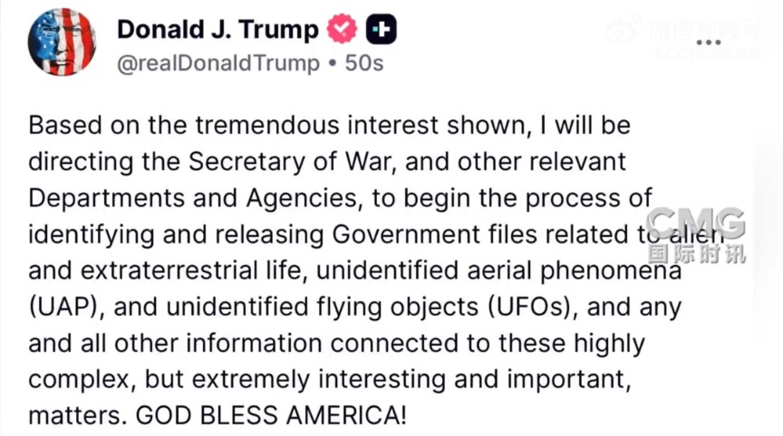当地时间2月19日,美国总统特朗普在社交媒体发帖称,鉴于公众“表现出巨大兴趣”,他将指示战争部长(国防部长)赫格塞思及相关部门与机构,着手启动识别并公开与外星人、地外生命、不明空中现象(UAP)以及不明飞行物(UFO)相关的政府文件。