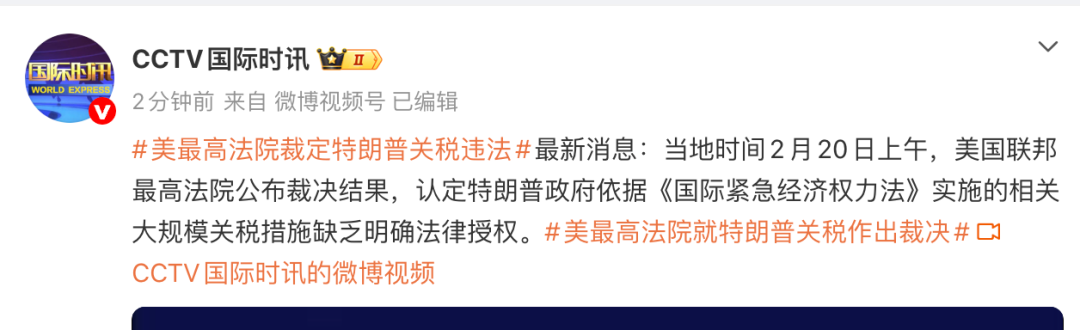 据CCTV国际时讯,当地时间2月20日上午,美国联邦最高法院公布裁决结果,认定特朗普政府依据《国际紧急经济权力法》实施的相关大规模关税措施缺乏明确法律授权。