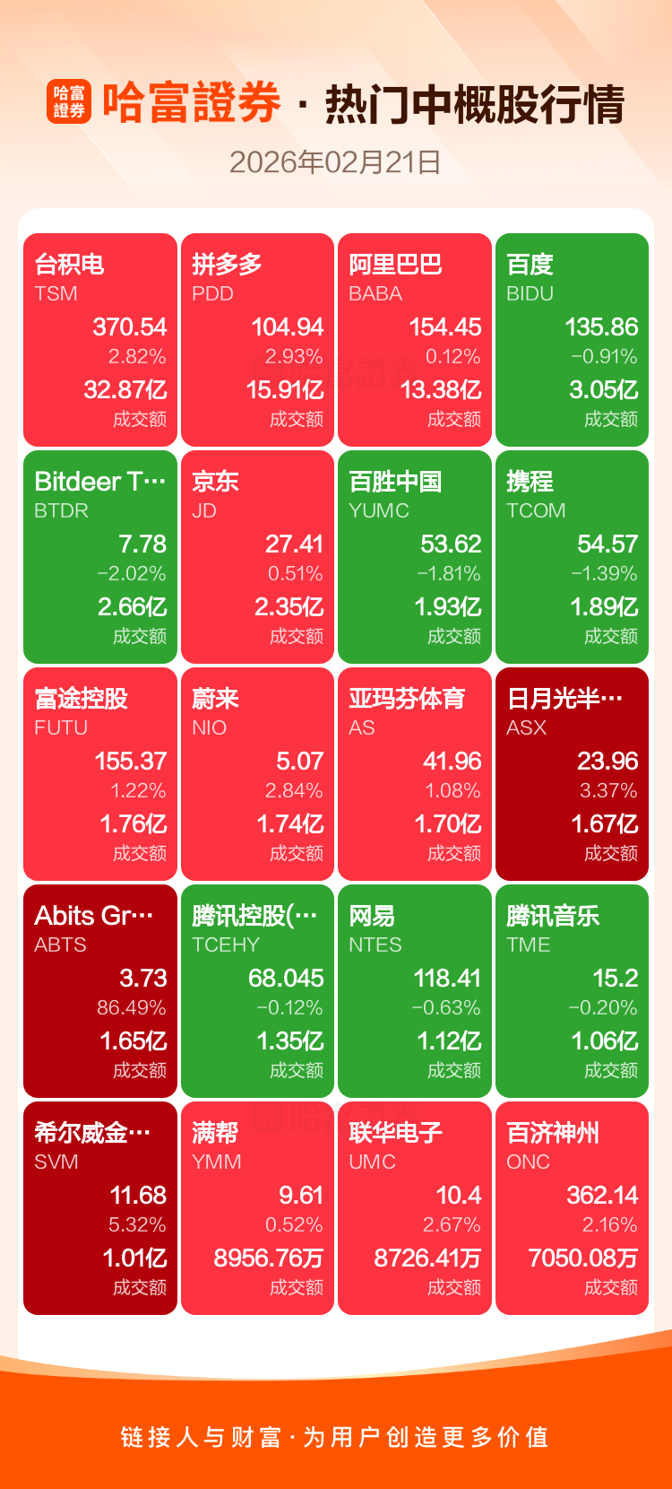台积电涨2.82%,拼多多涨2.93%,阿里巴巴涨0.12%,百度跌0.91%,Bitdeer Technologies Group-A跌2.02%,京东涨0.51%,百胜中国跌1.81%,携程跌1.39%,富途控股涨1.22%,蔚来涨2.84%。