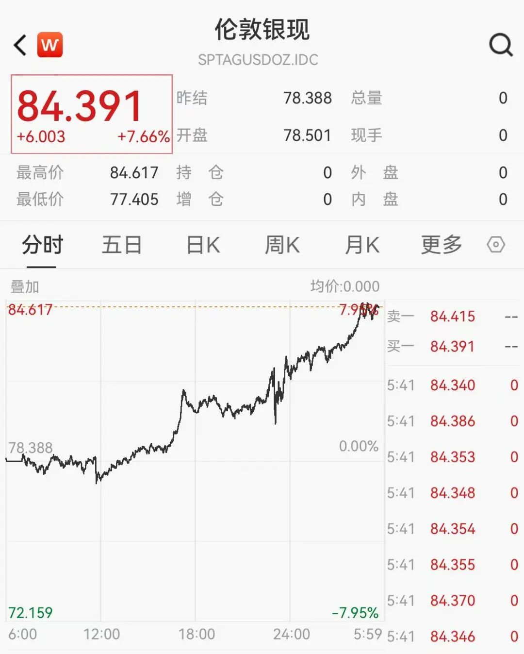 【大河财立方消息】2月20日晚,伦敦银现盘中持续拉升,盘中最高触及84.61美元/盎司,涨幅近8%;伦敦金现同步直线上攻,盘中跨过5100美元整数关口,涨幅近2%。