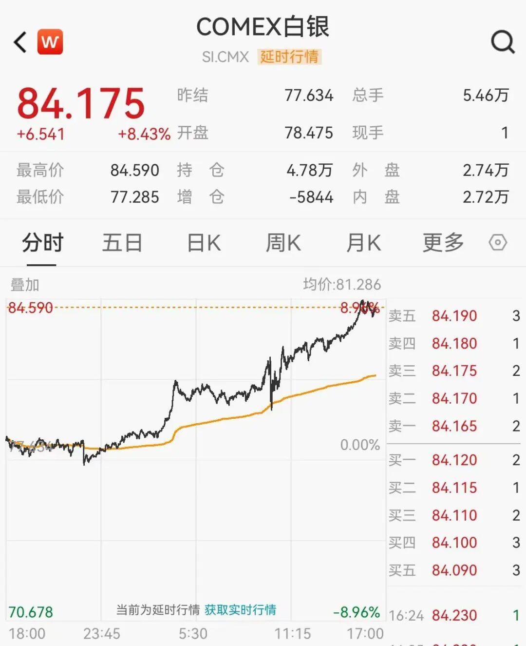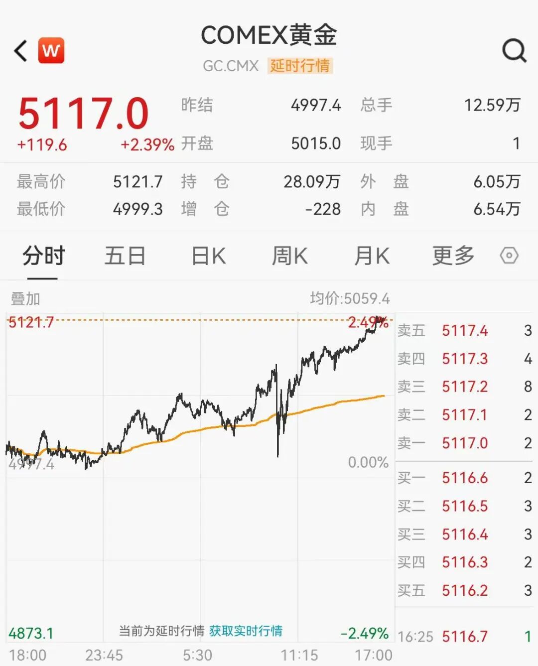 期货市场涨幅更为明显,COMEX黄金突破5120美元/盎司,日内涨近2.5%;COMEX白银日内涨超8.9%,逼近85美元/盎司。