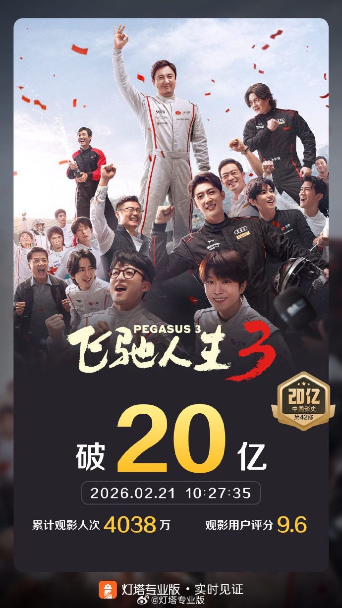 据灯塔专业版实时数据,截至2月21日10时,影片《飞驰人生3》票房突破20亿。