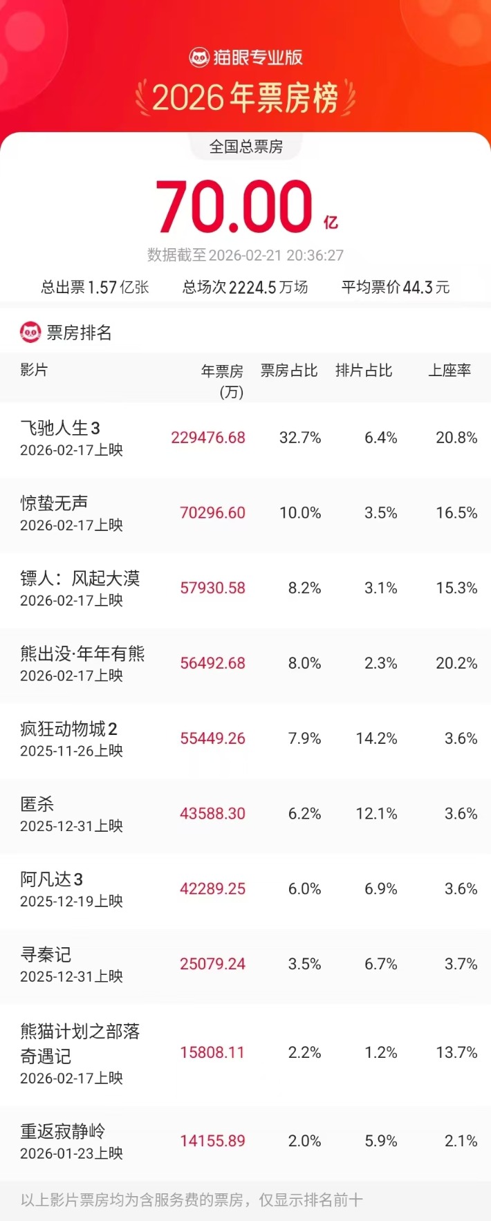 上证报中国证券网讯据猫眼专业版数据,截至2月21日20时36分,2026年年度电影总票房(含预售)已突破70亿元。《飞驰人生3》《惊蛰无声》《镖人:风起大漠》暂列年度票房榜前三位。