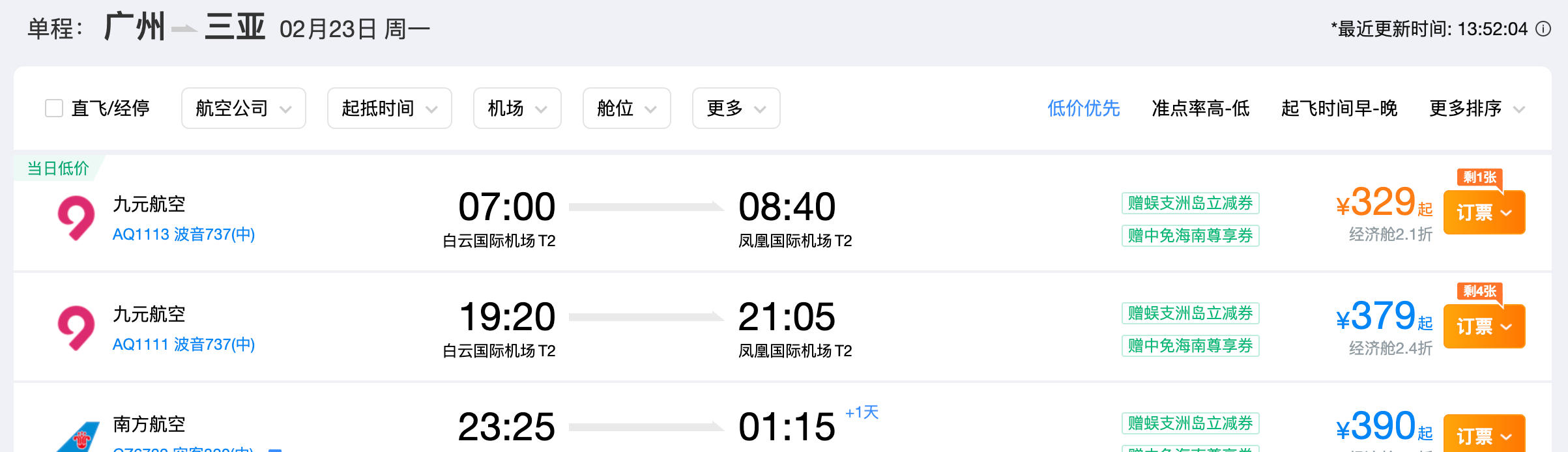 广州到三亚机票价格