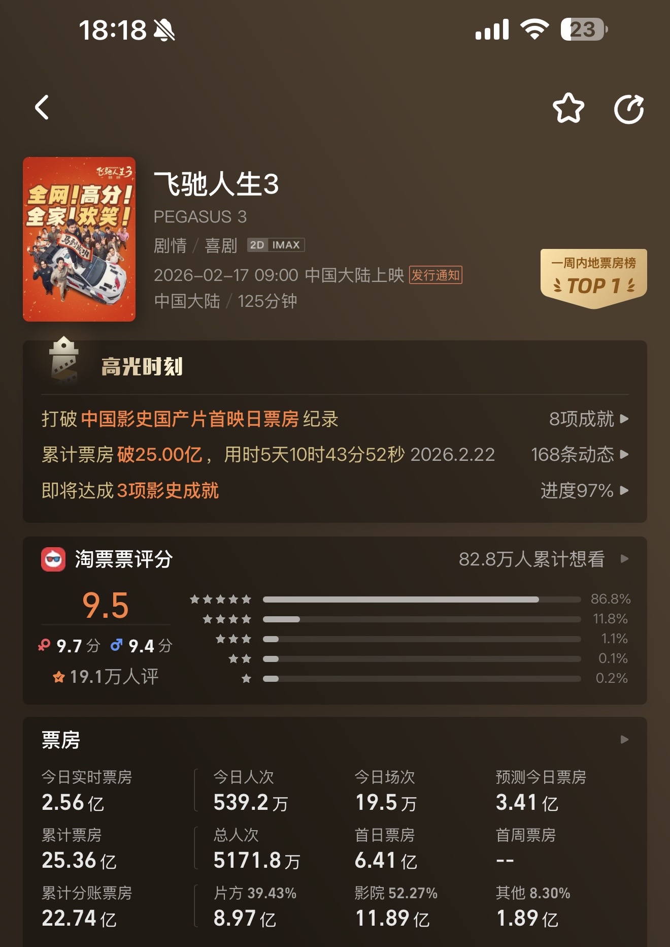 其中,韩寒执导、沈腾主演的《飞驰人生3》表现最为炸裂,截至2月22日累计票房已突破25.47亿元,以超50%的档期占比垄断半壁江山,成为绝对的票房支柱。该片淘票票评分9.5分,上映6天累计观影人次达5193.44万,平均票价49.0元,沈腾个人累计票房已逼近400亿元,持续验证其“票房福将”的地位。