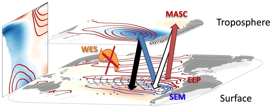 然而,在上海交大工作期间,马建与合作者发现起主导作用的并不是跨赤道反馈。他们从南北半球海温和风速的解耦现象出发,利用南太平洋海盆外的格林函数实验,颠覆了“跨赤道风—蒸发—海温反馈”机制在这个区域起主导作用的理论假说。他们提出的新机制名为“单半球倾斜风—蒸发—海温反馈”。以均匀增暖和直接辐射效应为激发点,发现南太平洋副热带高压向南迁移与增强,引起风速增强从而初步冷却海表。这个冷却信号向赤道方向传播,在传播过程中,源自海表的大气冷却在中上层受到绝热加热的阻挡。于是,中高空冷信号引起的海平面气压升高,与海表冷信号出现了约90度的南向相位差,从而形成“冷而又冷”的海气正反馈。