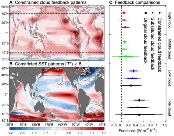 约束后的海表增暖型(B)和云辐射反馈:(A)水平分布与(C)全球平均值