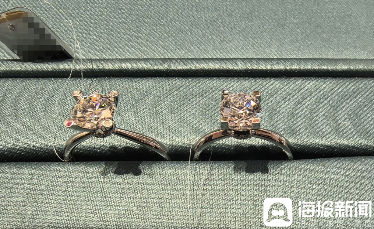 济南一家销售钻石饰品店铺里展示的1克拉天然钻石(左)和培育钻石(右)。