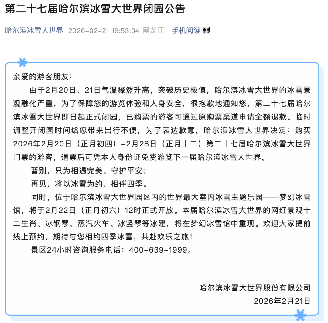 由于2月20日、21日气温骤然升高,突破历史极值,哈尔滨冰雪大世界的冰雪景观融化严重,为了保障您的游览体验和人身安全,很抱歉地通知您,第二十七届哈尔滨冰雪大世界即日起正式闭园,已购票的游客可通过原购票渠道申请全额退款。临时调整开闭园时间给您带来出行不便,为了表达歉意,哈尔滨冰雪大世界决定:购买2026年2月20日(正月初四)-2月28日(正月十二)第二十七届哈尔滨冰雪大世界门票的游客,退票后可凭本人身份证免费游览下一届哈尔滨冰雪大世界。