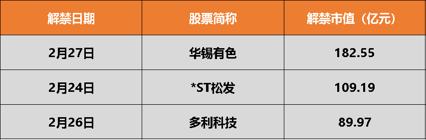 具体来看,华锡有色在2月27日将解禁3.57亿股,*ST松发在2月24日将解禁1.09亿股,均为定向增发机构配售股份。此外,多利科技在2月26日将解禁2.29亿股,为首发原股东限售股份。
