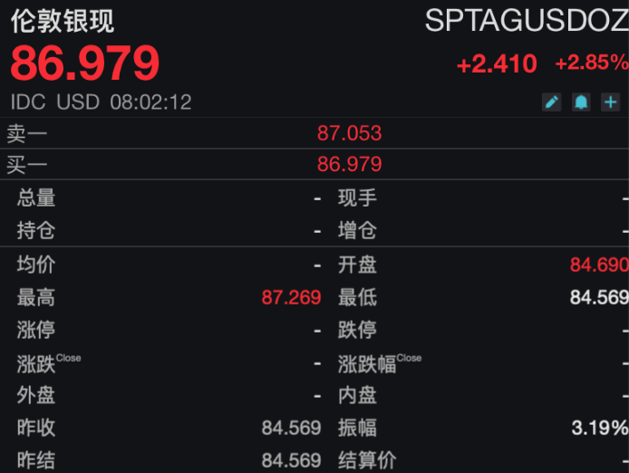 截至发稿,伦敦金现报5147.760美元/盎司,日内涨0.72%。伦敦银现日内涨超2%,报86.979美元/盎司,涨幅2.85%。