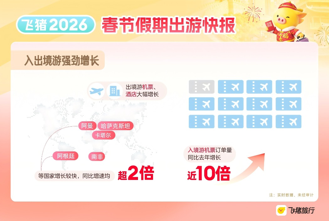 跨境游继续强劲增长。飞猪数据显示,该平台出境游机票、酒店、当地玩乐订单量均保持30%以上的同比增速。同时,越来越多的外国游客选择到中国过年,感受中国传统文化。该平台春节假期入境游机票订单量同比增长近10倍,上海、广州、成都、北京、大连、西安、杭州、深圳、福州、宁波等是受到游客青睐的“入境游首站”城市。