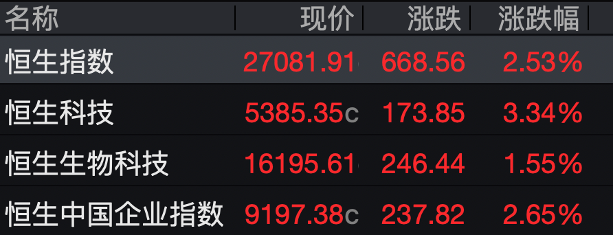 截至当日收盘,恒生指数收涨2.53%,收报27081.91点;恒生科技指数涨3.34%,报5385.35点;恒生国企指数涨2.65%,报9197.38点。