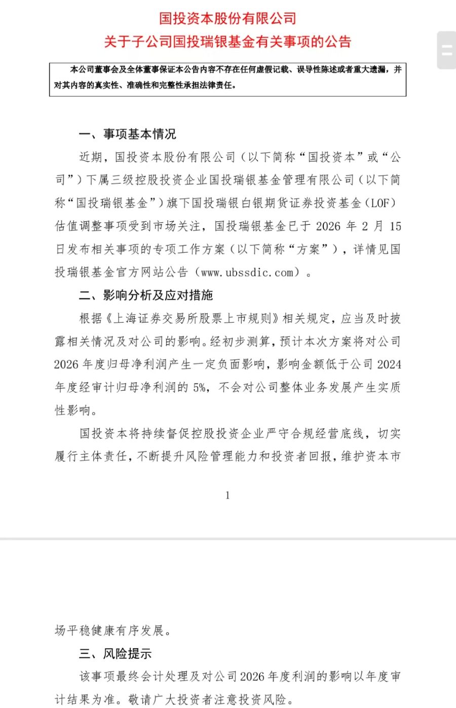 2月23日下午,国投资本(600061.SH)公告称,近期,公司下属三级控股投资企业国投瑞银基金管理有限公司旗下国投瑞银白银期货证券投资基金(LOF)估值调整事项受到市场关注,国投瑞银基金已于2026年2月15日发布相关事项的专项工作方案。