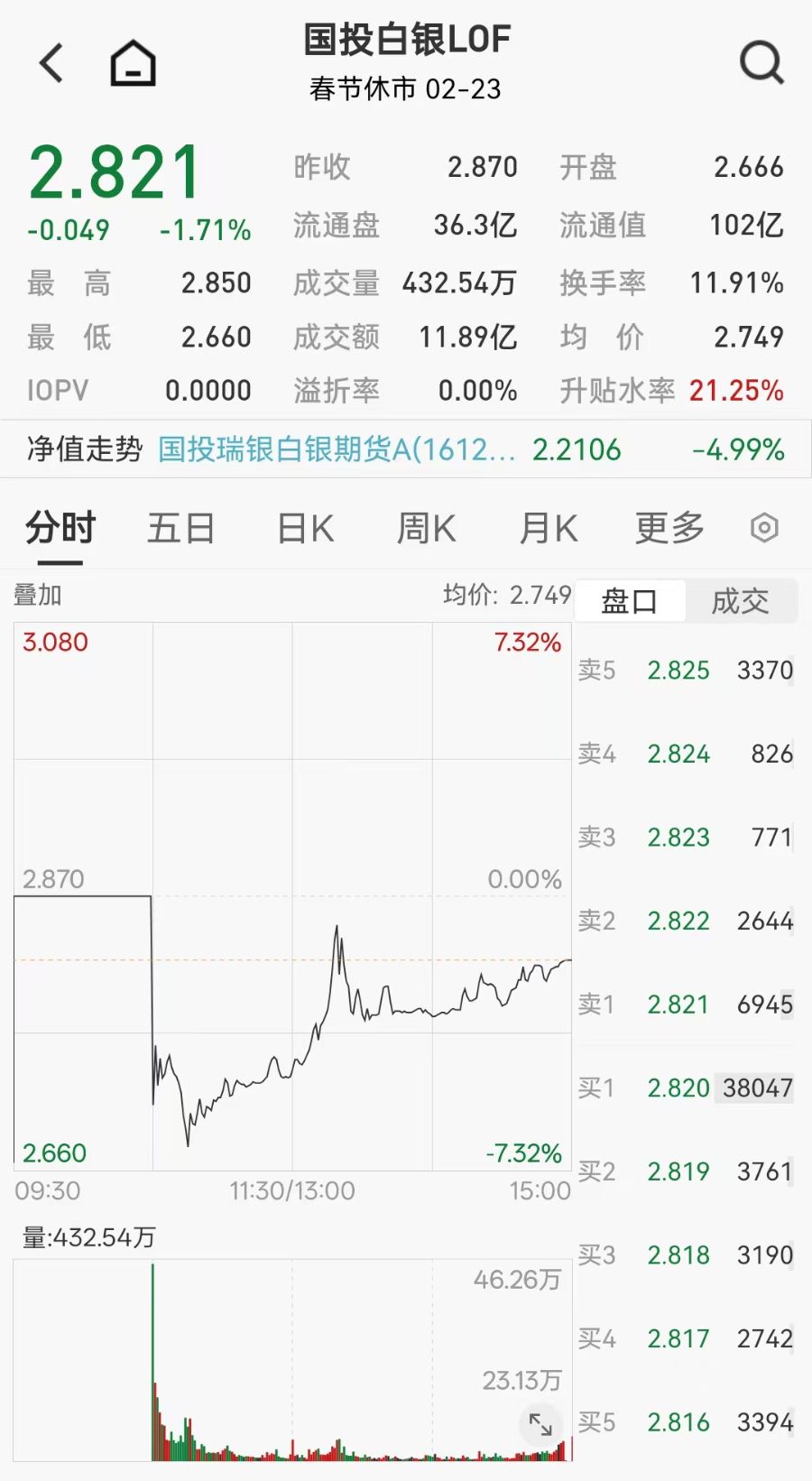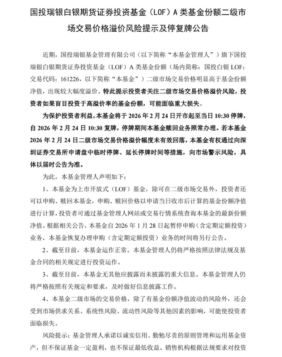 国投白银LOF强调,若本基金2026年2月24日二级市场交易价格溢价幅度未有效回落,本基金有权通过向深圳证券交易所申请盘中临时停牌、延长停牌时间等措施,向市场警示风险,具体以届时公告为准。