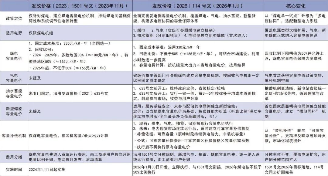2023年1501号文与2026年114号文容量电价政策对比表制表:黄锋