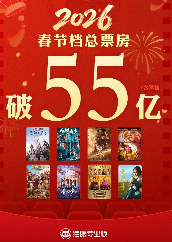 今年的大银幕迎来“最长春节档”。截至2月23日,2026年春节档(2026年2月15日至23日)总票房(含预售)已突破55亿元。与2025年相比,今年春节档同样呈现出明显不同的节奏——预售及首日表现相对克制,档期启动阶段略显“冷静”,随后凭借口碑发酵和观众二次传播,票房逐步走高。