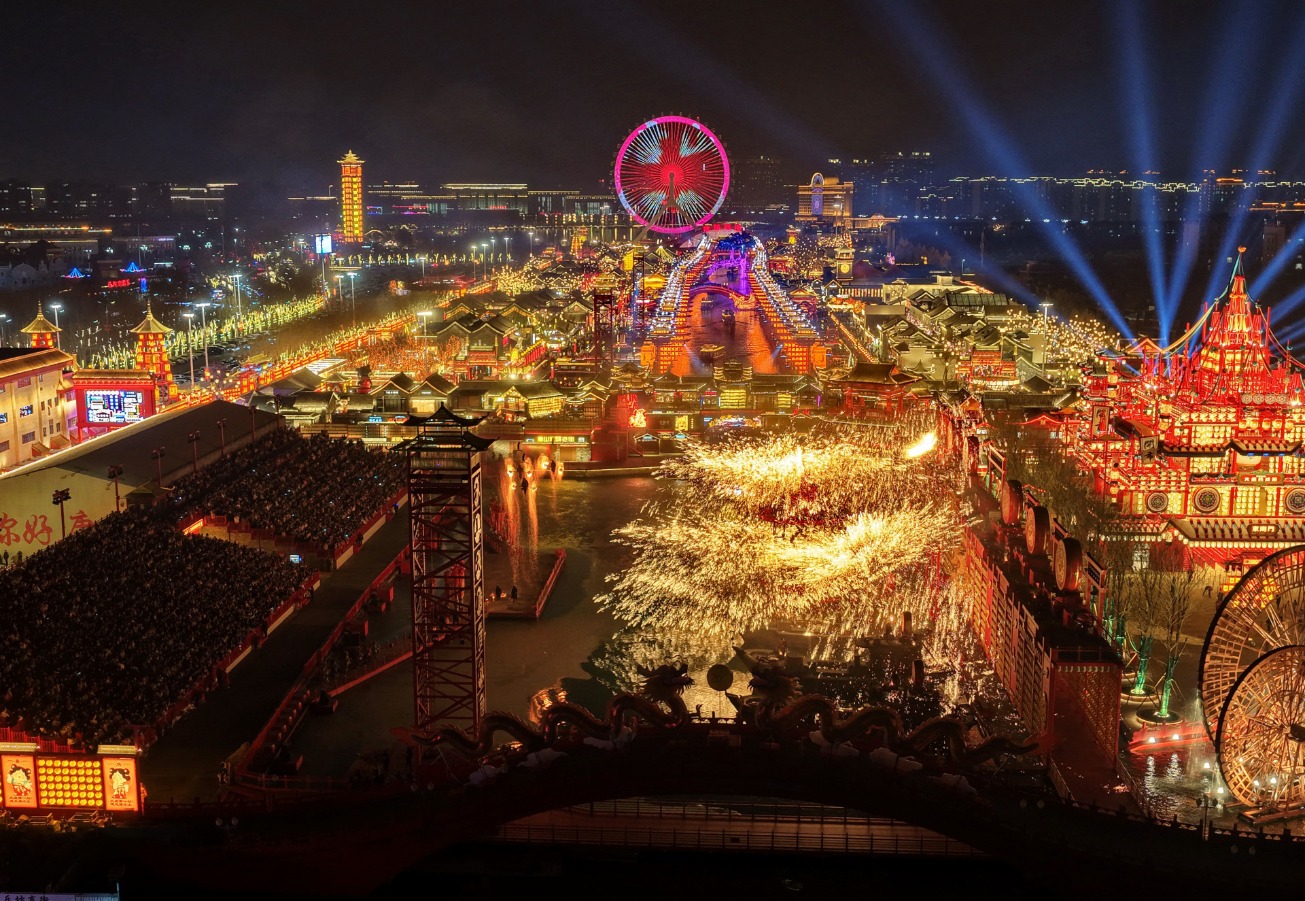 2月20日,民间艺人在河北省唐山市丰南区河头老街为游客表演“打树花” 图片来源:新华社记者杨世尧摄