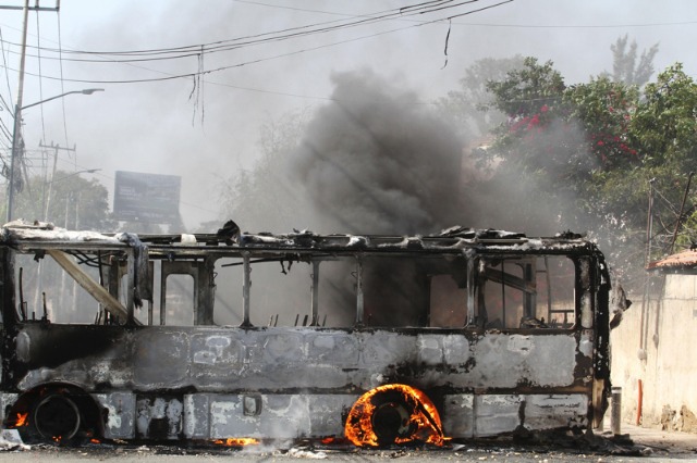 这是2月22日在墨西哥哈利斯科州首府瓜达拉哈拉拍摄的被焚烧的巴士。新华社
