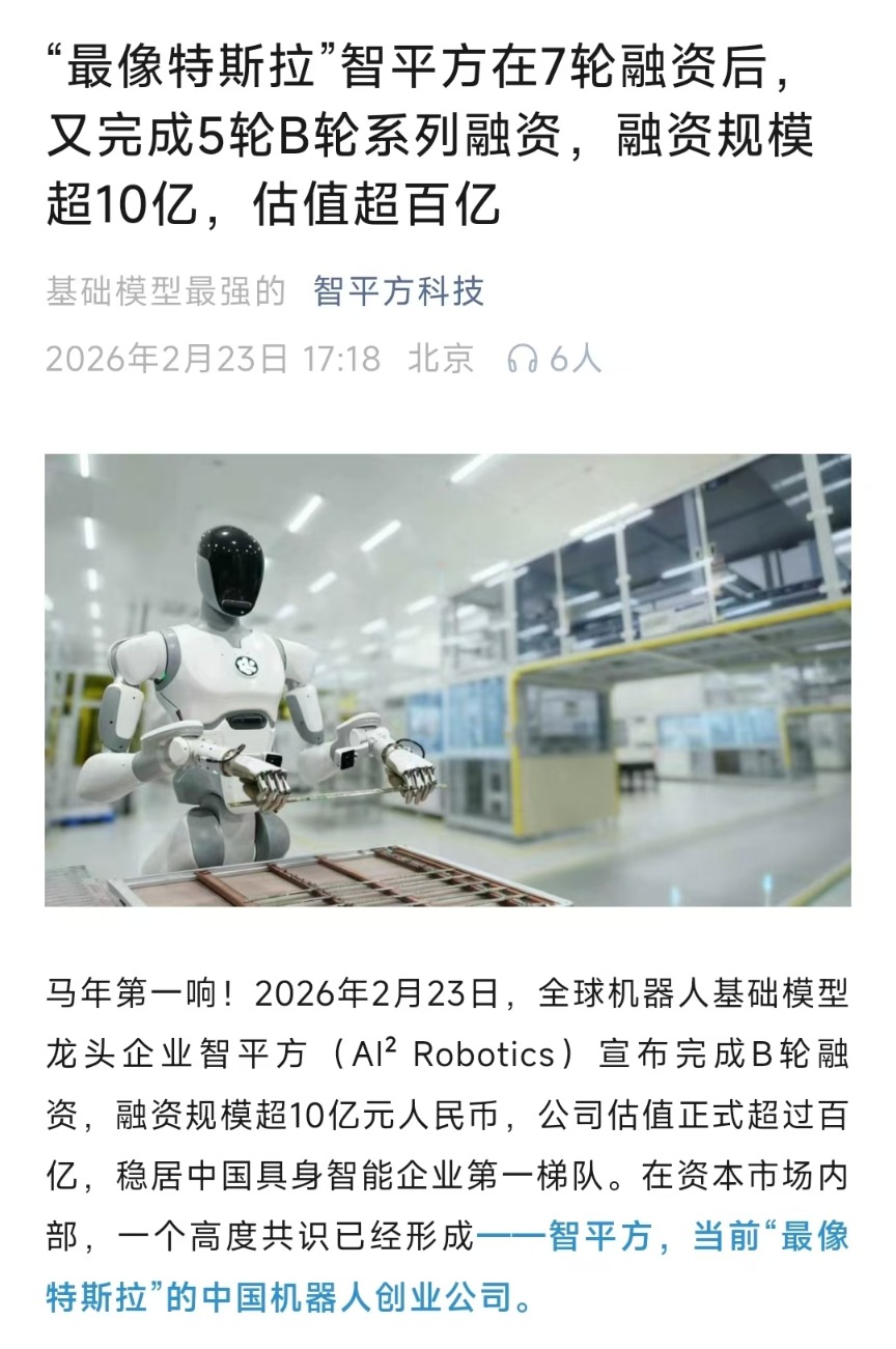 马年第一响!智平方科技微信公众号最新发文称,2月23日,来自深圳南山区的全球机器人基础模型龙头企业——智平方(AI² Robotics)宣布完成B轮融资,融资规模超10亿元,公司估值正式超过百亿元,稳居中国具身智能企业第一梯队。
