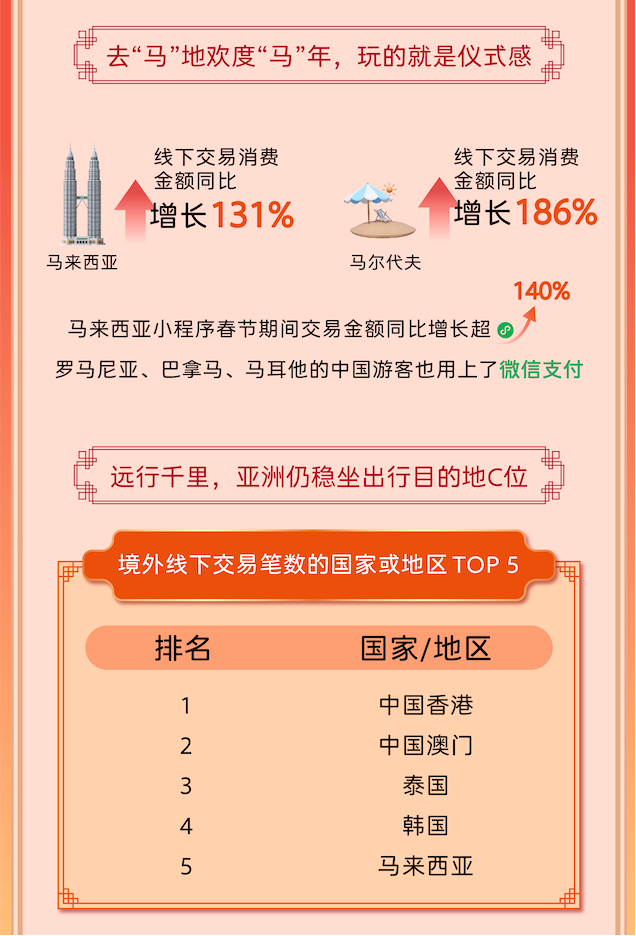 报告显示,带“马”字的目的地热度高涨,除了去马耳他、罗马尼亚感受异国风情,马来西亚与马尔代夫更是迎来大波中国游客潮,线下交易消费金额同比分别大涨131%和186%,马来西亚小程序春节期间交易金额同比增长超140%。春节假期,小程序在全球市场表现亮眼,交易金额同比增长超65%。