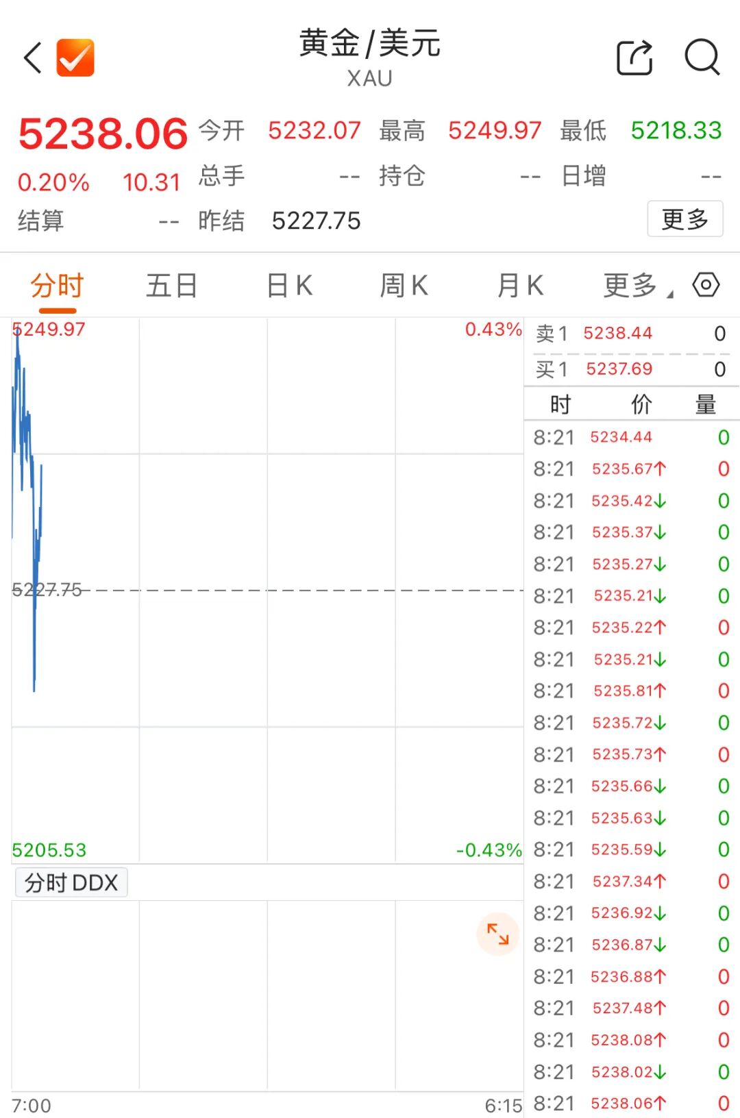 北京时间周一早盘时段,金价一度强势上涨,最高触及5249.97美元/盎司,在盘中跳水后震荡拉升,截至发稿报5238.06美元/盎司。