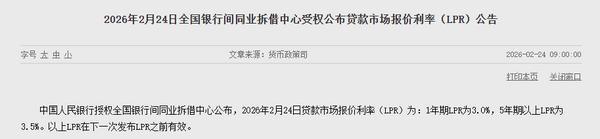 中国网财经2月24日讯今日,中国人民银行授权全国银行间同业拆借中心公布,2026年2月24日贷款市场报价利率(LPR)为:1年期LPR为3.0%,5年期以上LPR为3.5%,均较前值持平。以上LPR在下一次发布LPR之前有效。