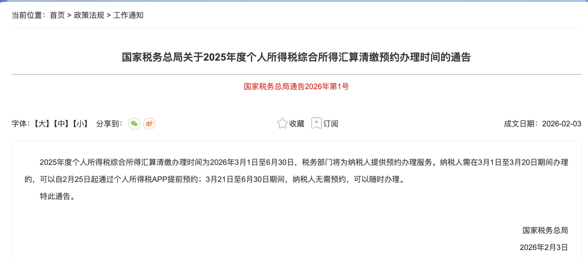央广网北京2月24日消息(记者樊瑞)日前,国家税务总局发布《关于2025年度个人所得税综合所得汇算清缴预约办理时间的通告》,这也是2026年国家税务总局发布的第1号通告。通告显示,2025年度个人所得税综合所得汇算清缴办理时间为2026年3月1日至6月30日,税务部门将为纳税人提供预约办理服务。