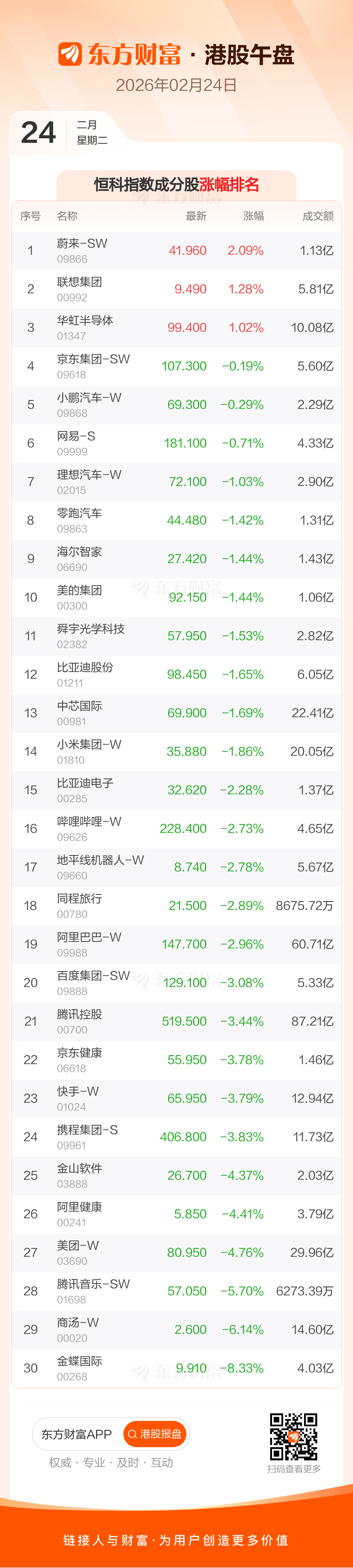 港股2月24日午盘走低 ,恒生指数收报26558.03点,跌523.88点,跌幅1.93%;恒生科技指数收报5258.0点,跌127.35点,跌幅2.36%。恒生指数成分股中万洲国际、华润啤酒、恒基地产涨幅居前,翰森制药、中国生物制药、中国人寿跌幅靠前。恒生科技指数成分股中蔚来-SW、联想集团、华虹半导体涨幅居前,金蝶国际、商汤-W、腾讯音乐-SW跌幅靠前。