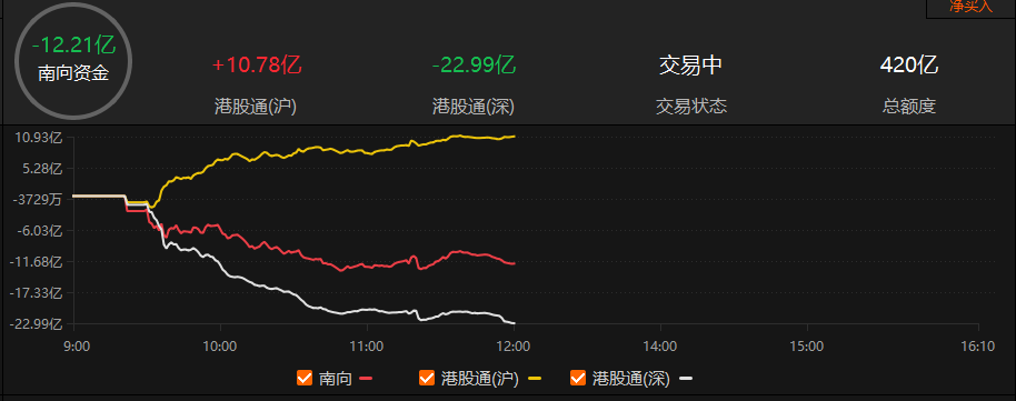 从南向资金来看,南向资金半日净卖出12.21亿港元,沪股通净买入10.78亿港元,深股通净卖出22.99亿港元。
