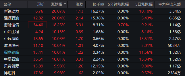 石油天然气板块持续走强,准油股份、惠博普、贝肯能源、通源石油、洲际油气、石化油服、中曼石油涨停,潜能恒信、科力股份涨超15%,博迈科、中海油服、蓝焰控股、海油发展、中国海油跟涨。