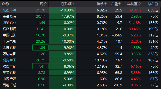 影视院线板块走弱,光线传媒、幸福蓝海跌超15%,中国电影、横店影视、博纳影业触及跌停,金逸影视、万达电影、上海电影、欢瑞世纪、华策影视跟跌。