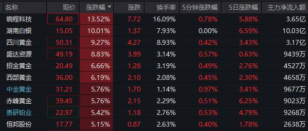 贵金属板块盘初走强,晓程科技涨超13%,湖南白银涨停,四川黄金、盛达资源、招金黄金、西部黄金、中金黄金等跟涨。