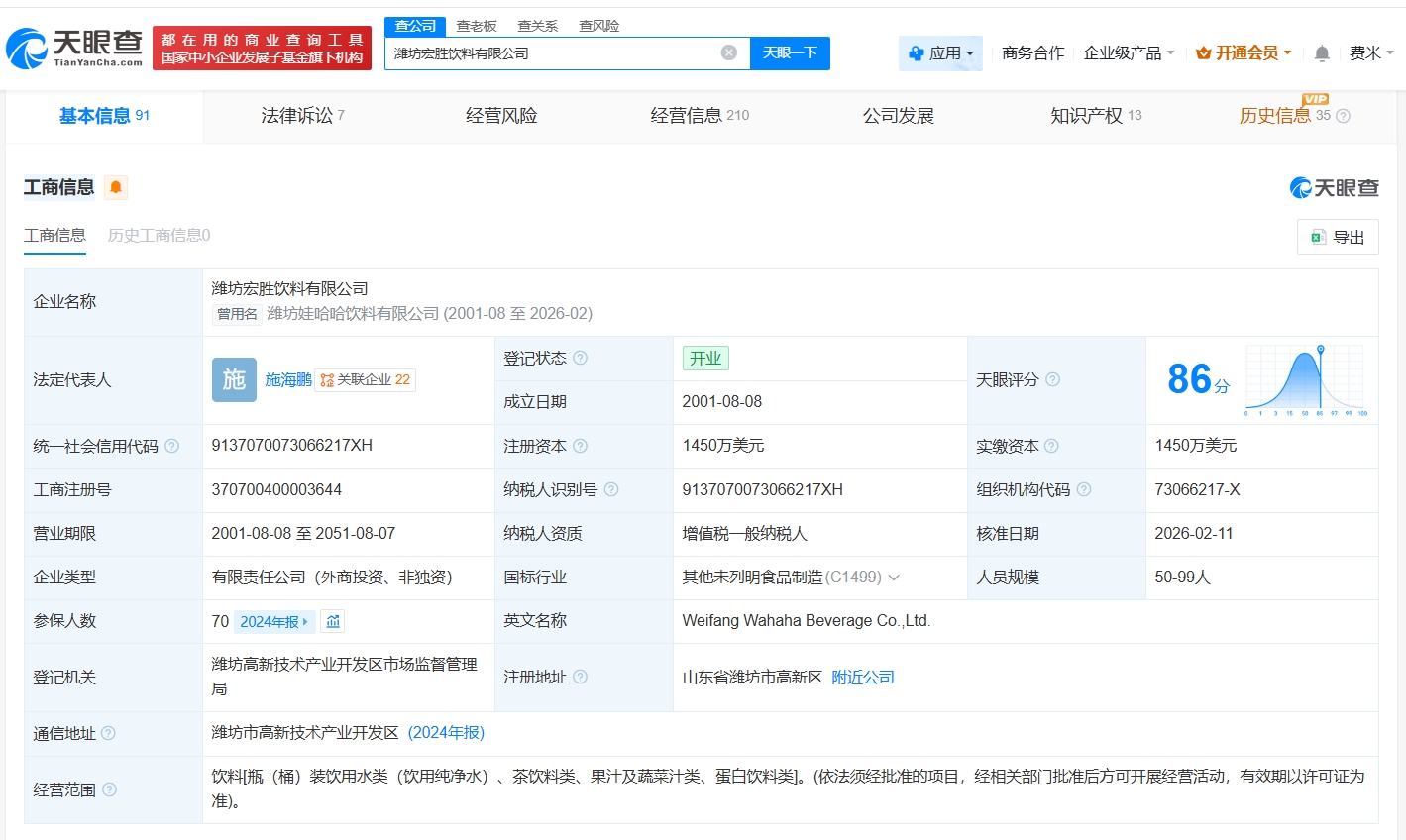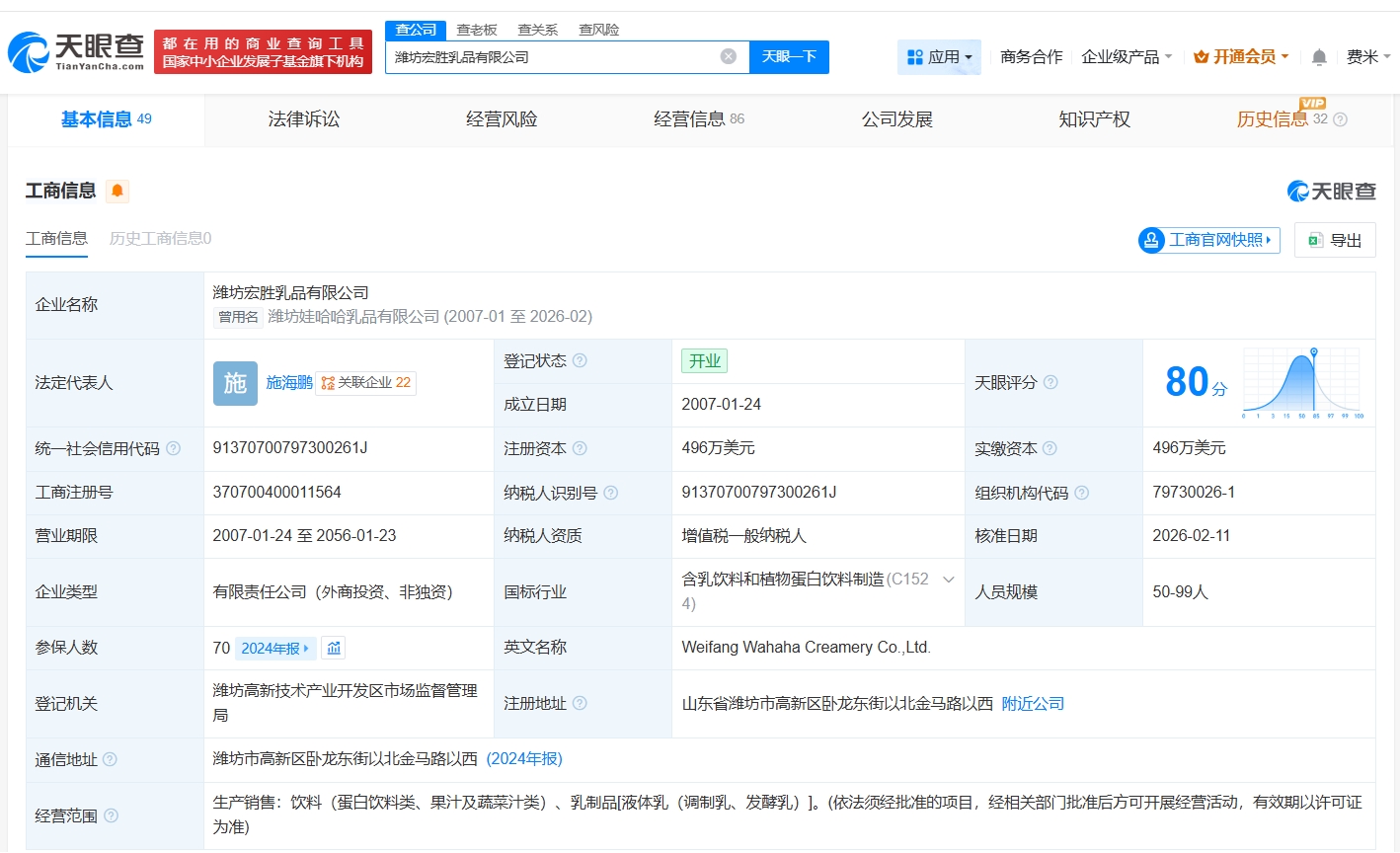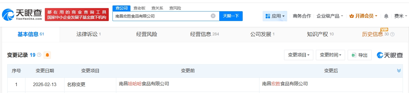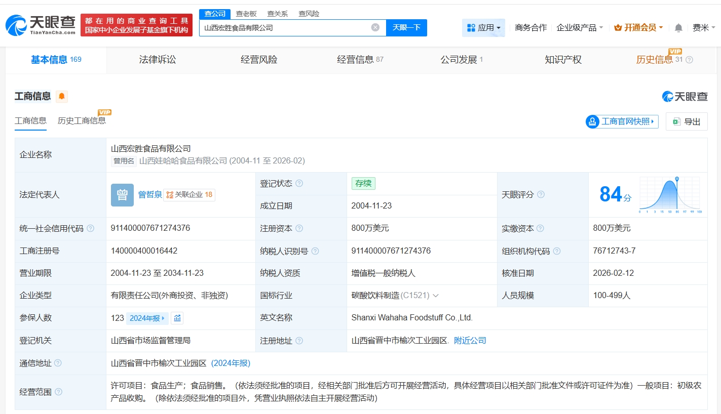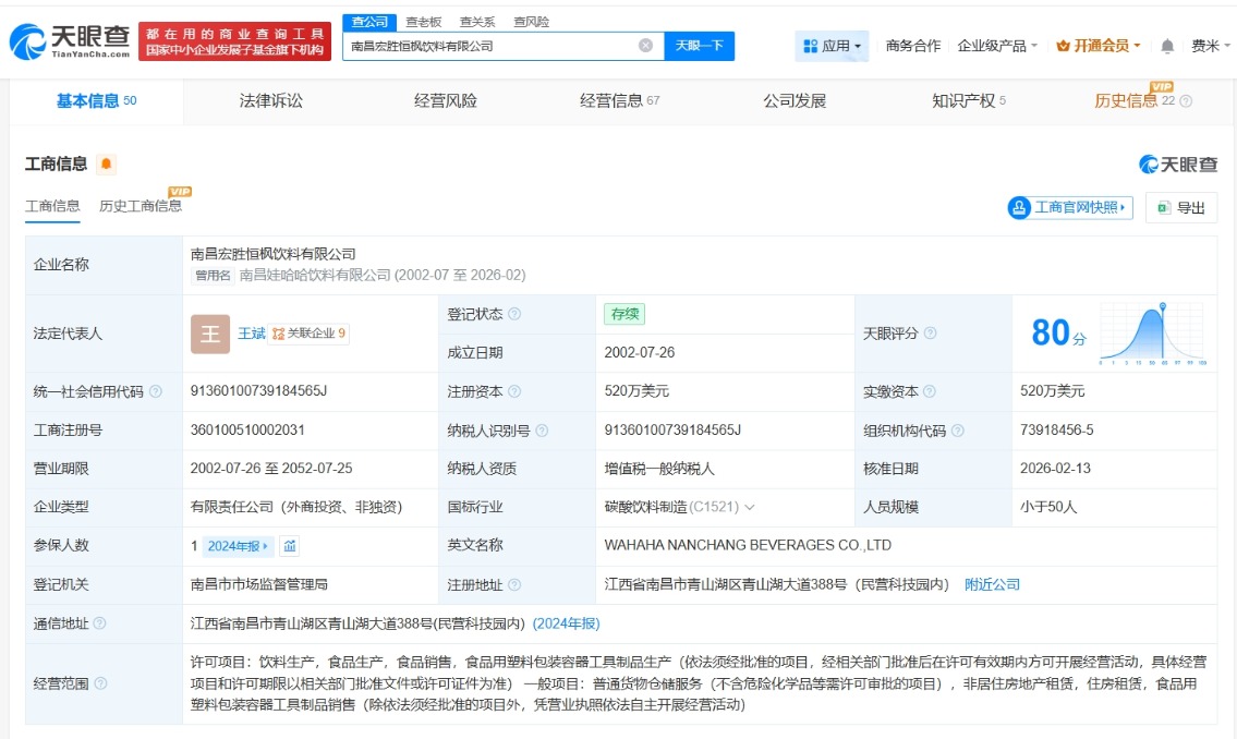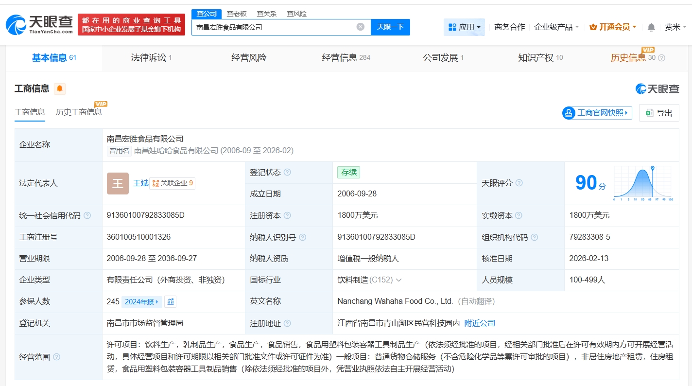 每经AI快讯,天眼查App显示,近日,南昌娃哈哈食品有限公司发生工商变更,企业名称变更为南昌宏胜食品有限公司。该公司成立于2006年9月,法定代表人为王斌,注册资本1800万美元,经营范围包括饮料生产、乳制品生产、食品生产等,由荣辉投资有限公司、丽水盛佳饮料有限公司共同持股。值得一提的是,近期,南昌宏胜恒枫饮料有限公司、山西宏胜食品有限公司、潍坊宏胜饮料有限公司、潍坊宏胜乳品有限公司均完成更名。