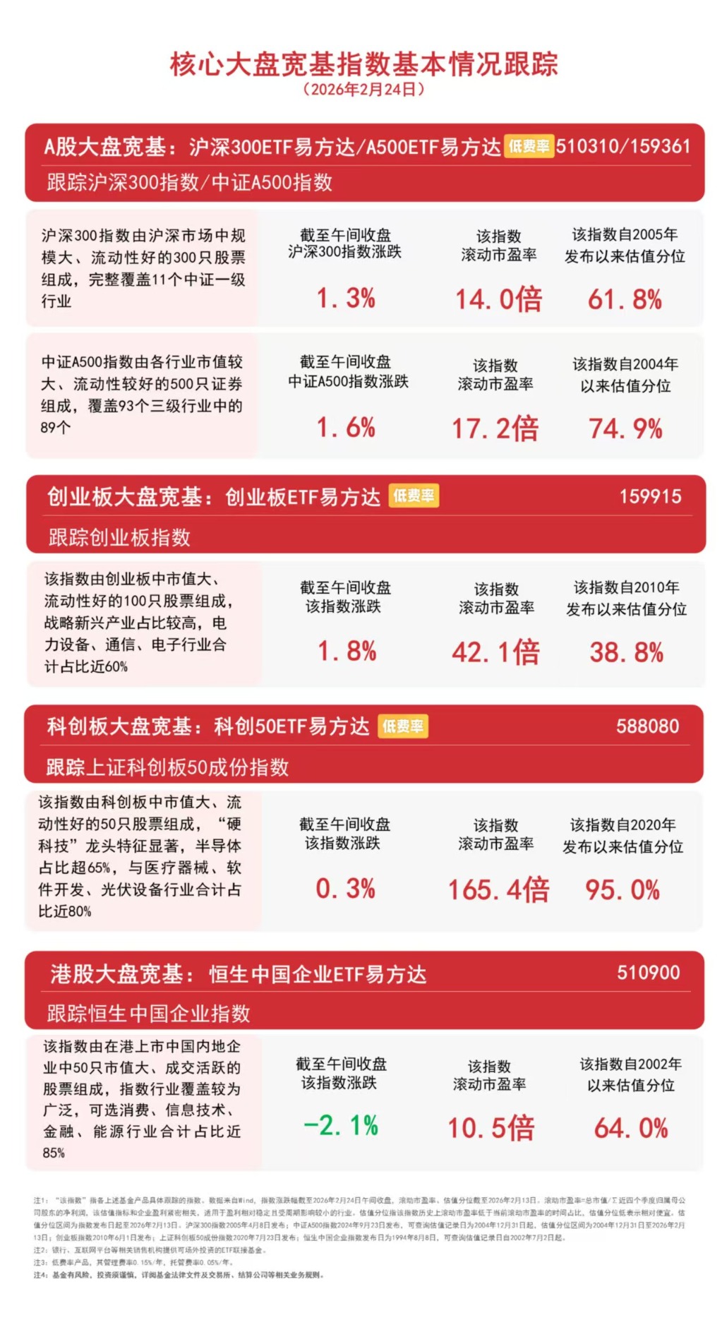 截至午间收盘,中证A500指数上涨1.6%,沪深300指数上涨1.3%,创业板指数上涨1.8%,上证科创板50成份指数上涨0.3%,恒生中国企业指数下跌2.1%。