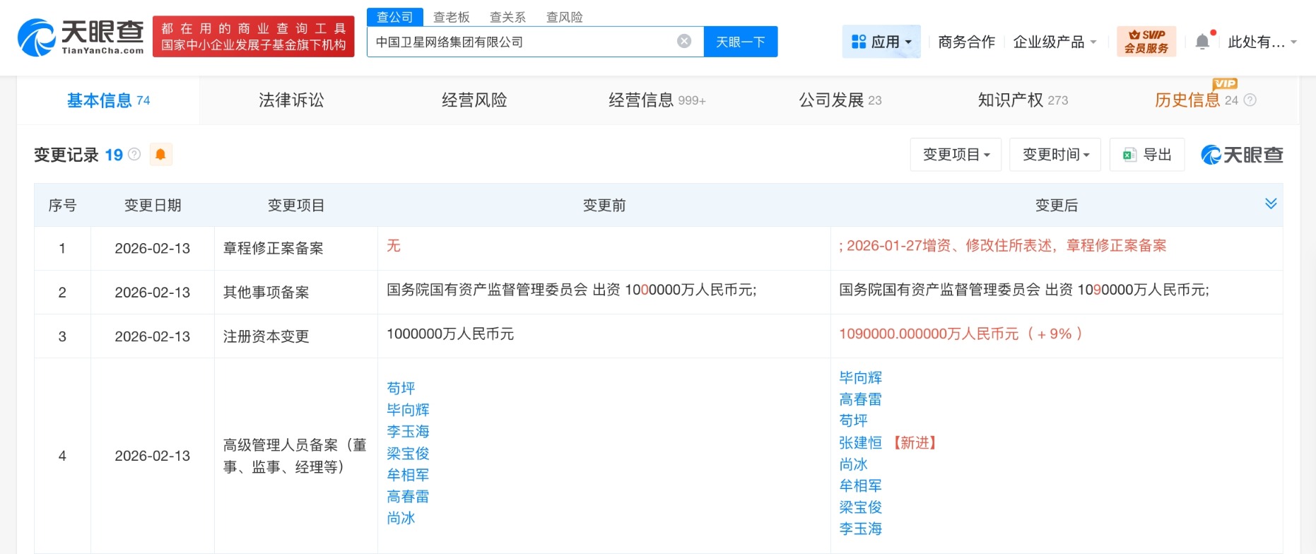 南方财经2月24日电,天眼查App显示,近日,中国卫星网络集团有限公司发生工商变更,注册资本由100亿人民币增至109亿人民币,增幅9%,同时,部分高管也发生变更。该公司成立于2021年4月,法定代表人为苟坪,经营范围含卫星互联网的论证设计、研究试验、工程设计、工程建设,卫星互联网发射和测控服务,基础电信业务,信息服务,卫星通信、广播、导航、遥感业务及综合服务等。股东信息显示,该公司由国务院国有资产监督管理委员会全资持股。